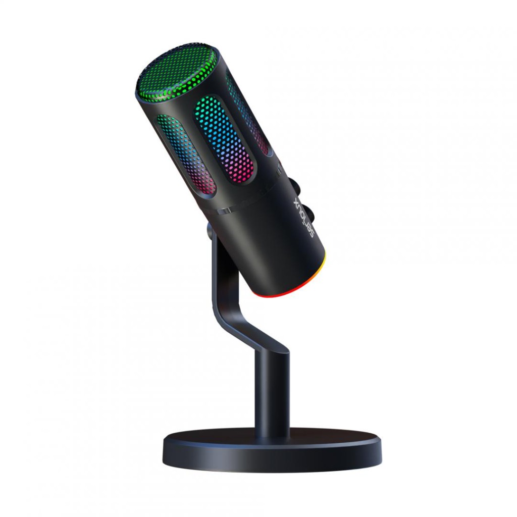 Serioux SU8 Desktop Gaming Microphone, condenser, unidirectional, frequency response 20-20KHz, maximum sensitivity -11DBFS at 80 dB SPL, sampling rate 48KHz, bit rate 16/24bit, signal-to-noise ratio 75dB, 3.5mm and USB-C interface, input power 5V, 200mA, weight 325g, RGB lighting, suitable for gaming & streaming, black