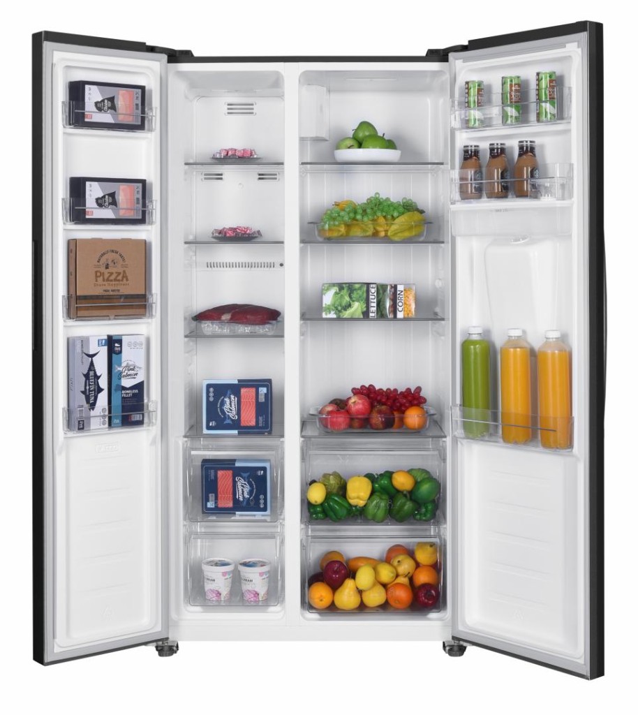 Side by side Fram FSBS-HM440NFXWDE++, Full No Frost, Inverter compressor, water dispenser, energy class E, LED display with touch control, total capacity: 439L, refrigerator capacity: 288L, freezer capacity: 151L, LED light, Holiday function, ECO function, Super freeze function, door open alarm, child lock, 3 refrigerator glass shelves, 2 compartments for fruits and vegetables, 3 freezer shelves, 2 freezer drawers, dimensions (WxDxH): 90 x 59 x 177 cm, color: Stainless steel appearance