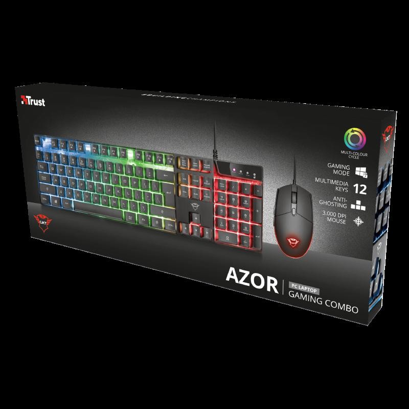 Keyboard Kit + Mouse Trust GXT 838 Azor Gaming Combo (keyboard with mouse) Key features KEYBOARD Full-size keyboard layout3 combined LED color modes with adjustable brightness Anti-Ghosting: up to 8 simultaneous key pressings Game mode switch; directly disable Windows key Anti-slip rubber feet and 2 steps height adjustable 12 multimedia function keys MOUSE Speed select button (800 – 3000DPI) 6 responsive buttons Continuous cycling colors Smooth, low-friction gliding pads General Specifications Total weight 758 g Weight of main unit 621 g Compatibility Compatible Device Types pc, laptop, gaming console Compatible Consoles PS4, Xbox One Compatible Software Platforms Mac OS, CHEINNERome OS, Windows