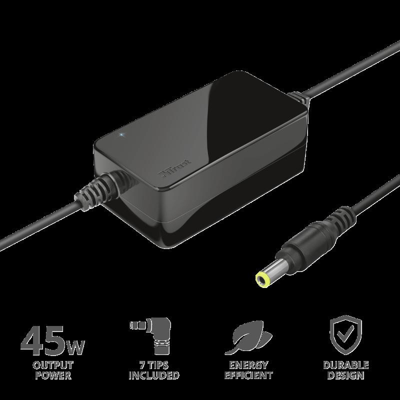 Charger Laptop Trust Primo 45W Universal Laptop Charger Specifications General Number of USB ports 0 Height of main product (in mm) 32 mm Width of main product (in mm) 50 mm Depth of main product (in mm) 87 mm Weight of main unit 269 g Connectivity Cable length power input 120 cm Cable length power output 180 cm Features Number of tips / connectors included 6 Free Tip / Connector Service available yes Protection Protections over-charge, short-circuit Input Power plug type EU Power source wall socket Input power 100 -240V AC 50 / 60Hz Output Voltage setting fixed Output voltage 19 Max output amperes 2.4 A Total max output power (W) 45 Watt Mains socket Power cable length 120 cm Other Power Factor Control no Compatibility Laptop voltage range 18 V – 20 V Compatible Device Types laptop Compatible Brands Acer, Asus, Dell, HP, Lenovo, Medion, MSI, Packard Bell, Samsung https://www.trust.com/en/product/21904-primo-45w-universal-laptop- charger