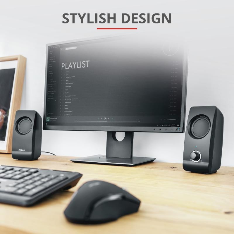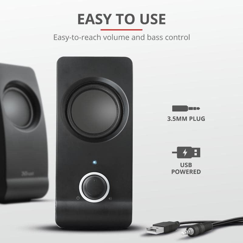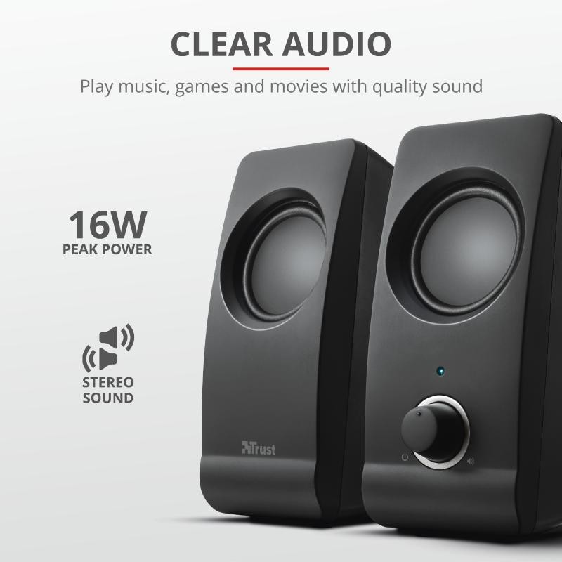 SPEAKERS Stereo Trust Remo 2.0 Speaker Set General Specifications Type of speaker 2.0 Height of main product (in mm) 175 mm Width of main product (in mm) 80 mm Depth of main product (in mm) 80 mm Total weight 600 g Connectivity Connection type wired Cable length power cable 150 cm Cable length audio cable 150 cm Cable length satellite cable 100 cm Bluetooth no Cables included Fixed on speaker Audio Driver size 60 mm Driver units 2 Speaker impedance 4 Ohm Audio input 3.5 mm Input impedance 10000 Ohm Audio output None Headphone connection no Microphone built-in no Microphone connection no Power output (peak) 16 W Power output (RMS) 8 W Frequency response 50 Hz – 20000 Hz Features NFC no Hands-free phone calls no Tripod mount no Power saving no Lighting Lights no Protection Waterproof no Power Power detachable cable no Input Power POWER SUPPLY USB Compatibility Compatible Device Types pc, laptop Compatible Consoles no General compatibility PC with 3.5mm audio output and USB port Control Controls volume, on / off Remote control no Satellites Satellite Height (mm) 175 mm Satellite Width (mm) 80 mm Satellite Depth (mm) 80 mm Satellite Weight (gr) 300 gr https://www.trust.com/en / product / 17595-remo-2-0-speaker set