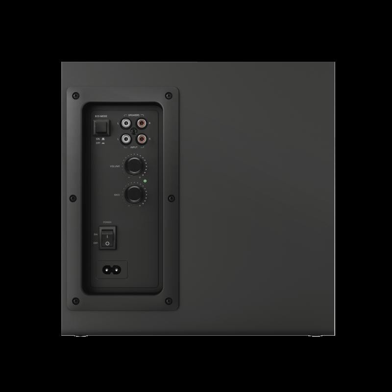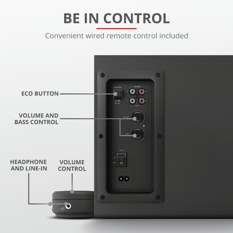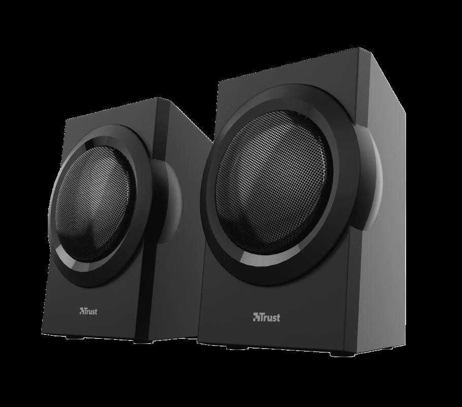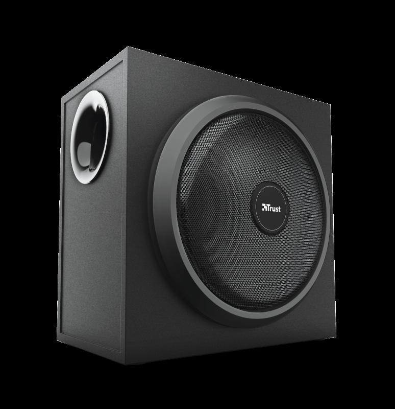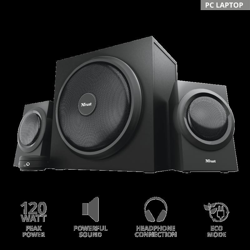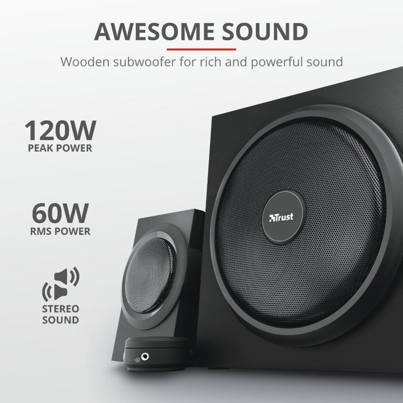 Audio system Trust Yuri 2.1 Speaker Set Specifications General Height of main product (in mm) 240 mm Width of main product (in mm) 180 mm Depth of main product (in mm) 240 mm Total weight 3720 g Weight of main unit 2220 g Connectivity Connection type wired Cable length power cable 150 cm Cable length audio cable 150 cm Cable length satellite cable 140 cm Bluetooth no Cable length subwoofer to remote cable 180 cm Cables included power cable, 3.5mm audio cable Audio Driver units 3 Speaker impedance 4 Ohm Audio input 3.5 mm Input impedance 680 Ohm Audio output None Headphone connection yes Microphone built-in yes Microphone connection no Power output (peak) 120 W Power output (RMS) 60 W Power output – subwoofer (RMS) 30 W Power output – satellite (RMS) 15 W Frequency response 20 Hz – 20000 Hz Features NFC no Hands-free phone calls no Tripod mount no Accessories 3.5mm audio cable Power saving yes Lighting Lights no Protection Waterproof no Power Power cable detachable yes Input Power source wall socket Compatibility Compatible Consoles no Compatible Device Types pc, smartphone, laptop, tablet Control Controls volume Remote control wired Satellites Satellite Height (mm) 154 mm Satellite Width (mm) 115 mm Satellite Depth (mm) 75 mm Satellite Weight (gr ) 350 gr Subwoofer Subwoofer Height (mm) 240 mm Subwoofer Width (mm) 180 mm Subwoofer Depth (mm) 180 mm Subwoofer Weight (gr) 2222 gr Remote Batteries for remote included no https://www.trust.com/en/Product/Yuri-23 696-2-1-speakerset