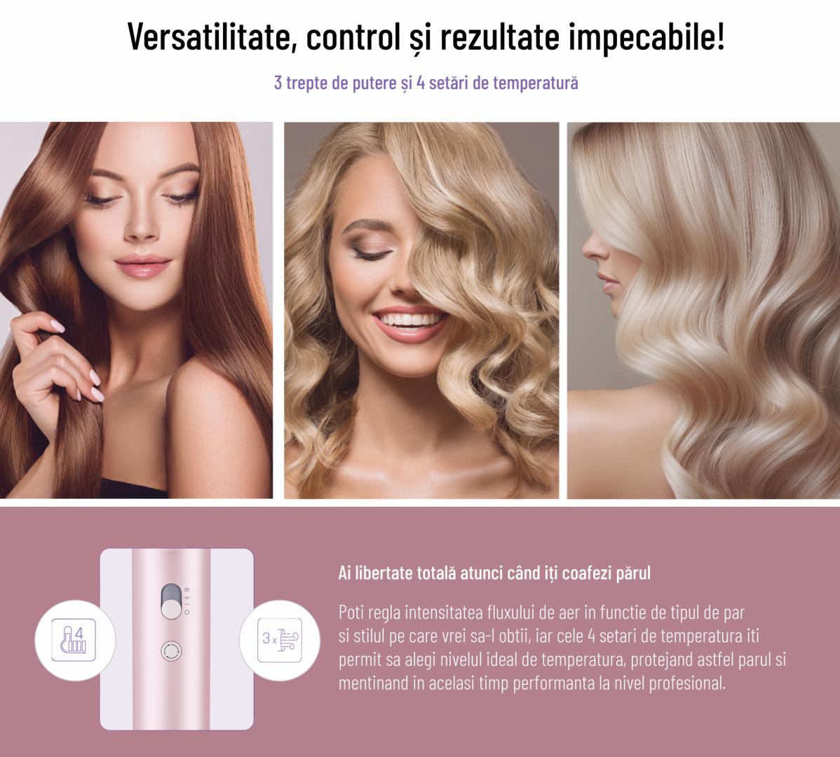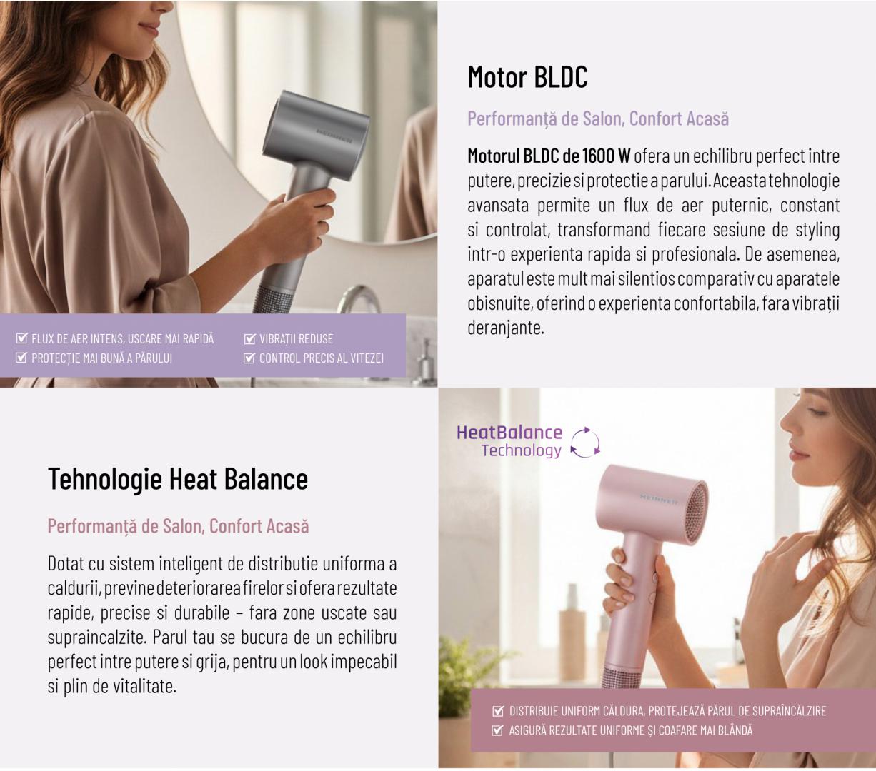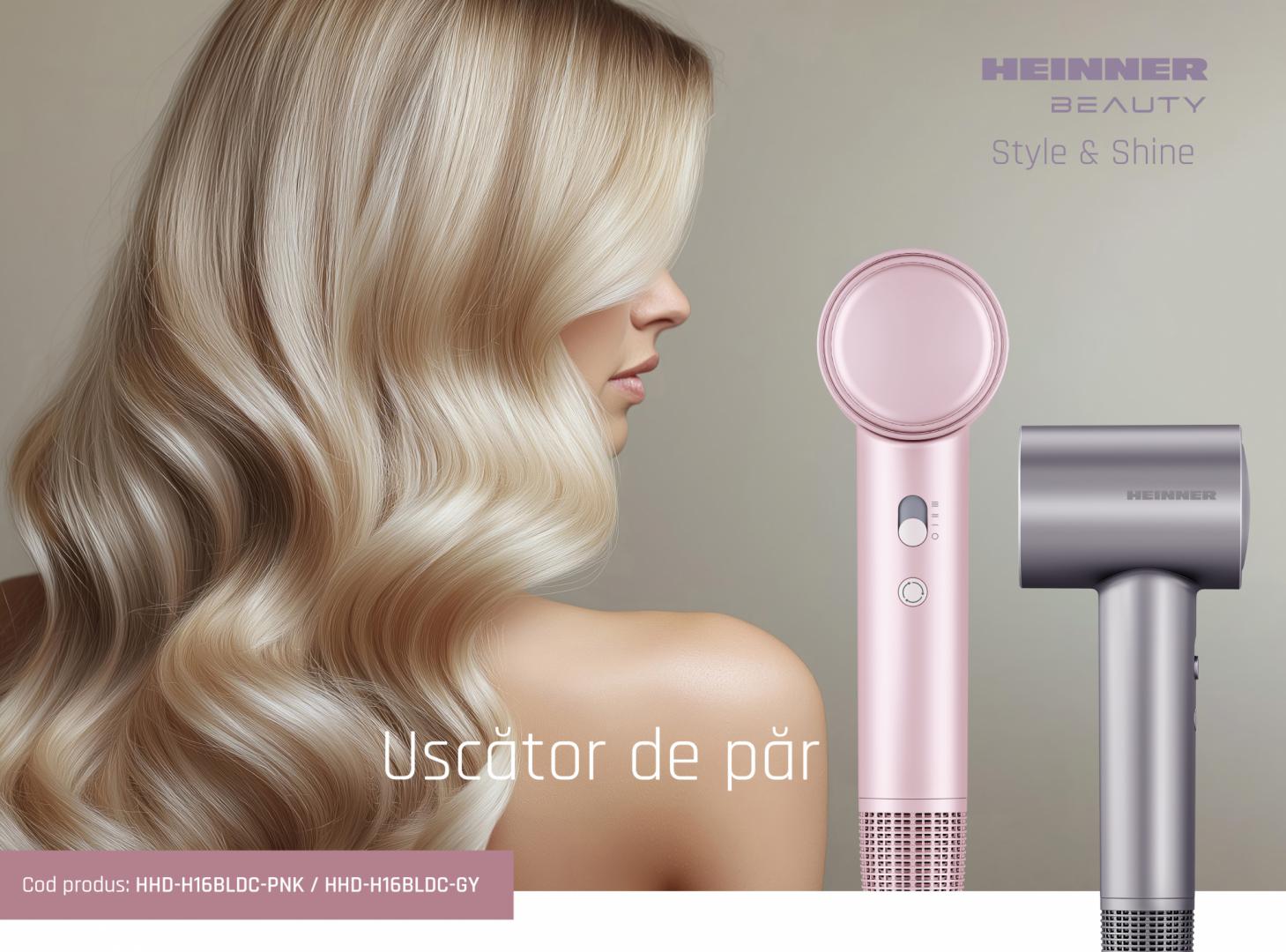 Uscator de par Heinner HHD-H16BLDC-PNK, Tehnologie Heat Balance, ionizare, motor BLDC, putere: 1600 W, 3 trepte de putere, 4 setari de temperatura, concentrator magnetic, culoare: roz