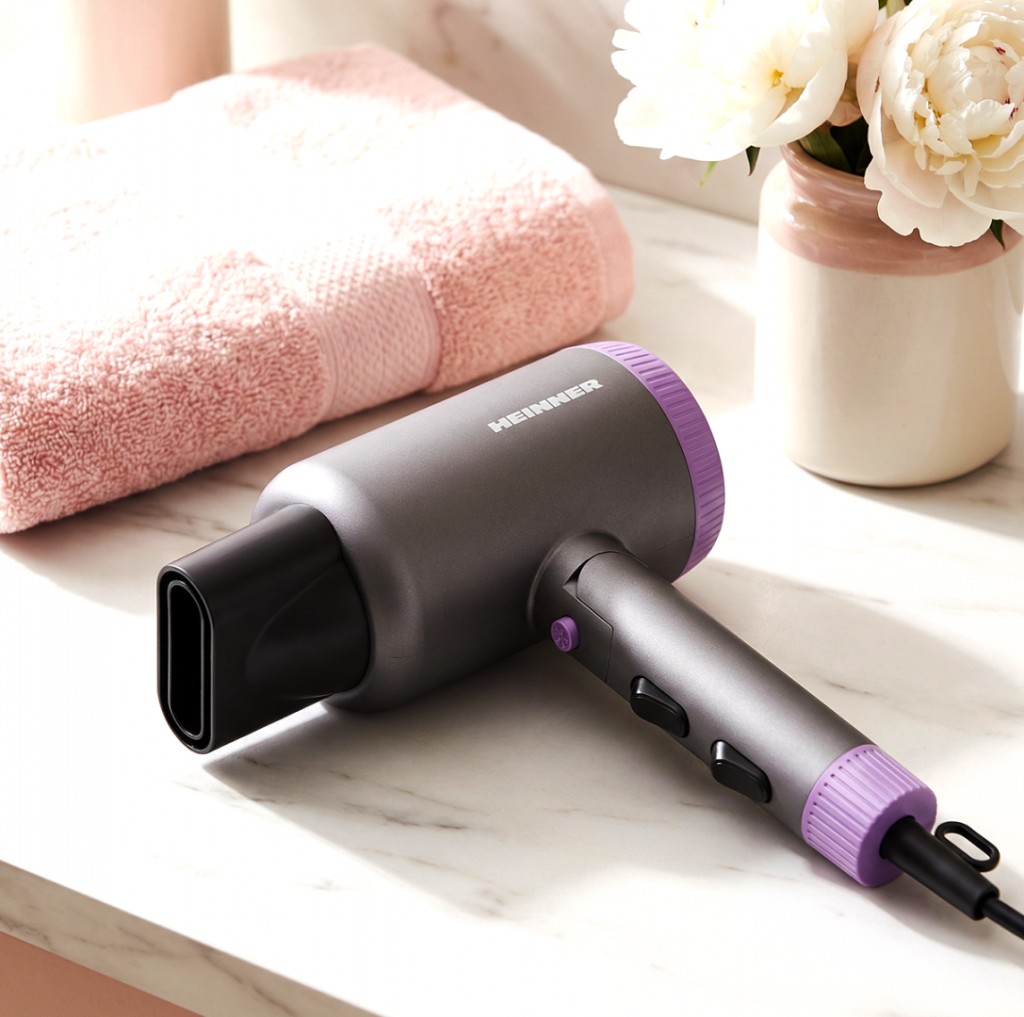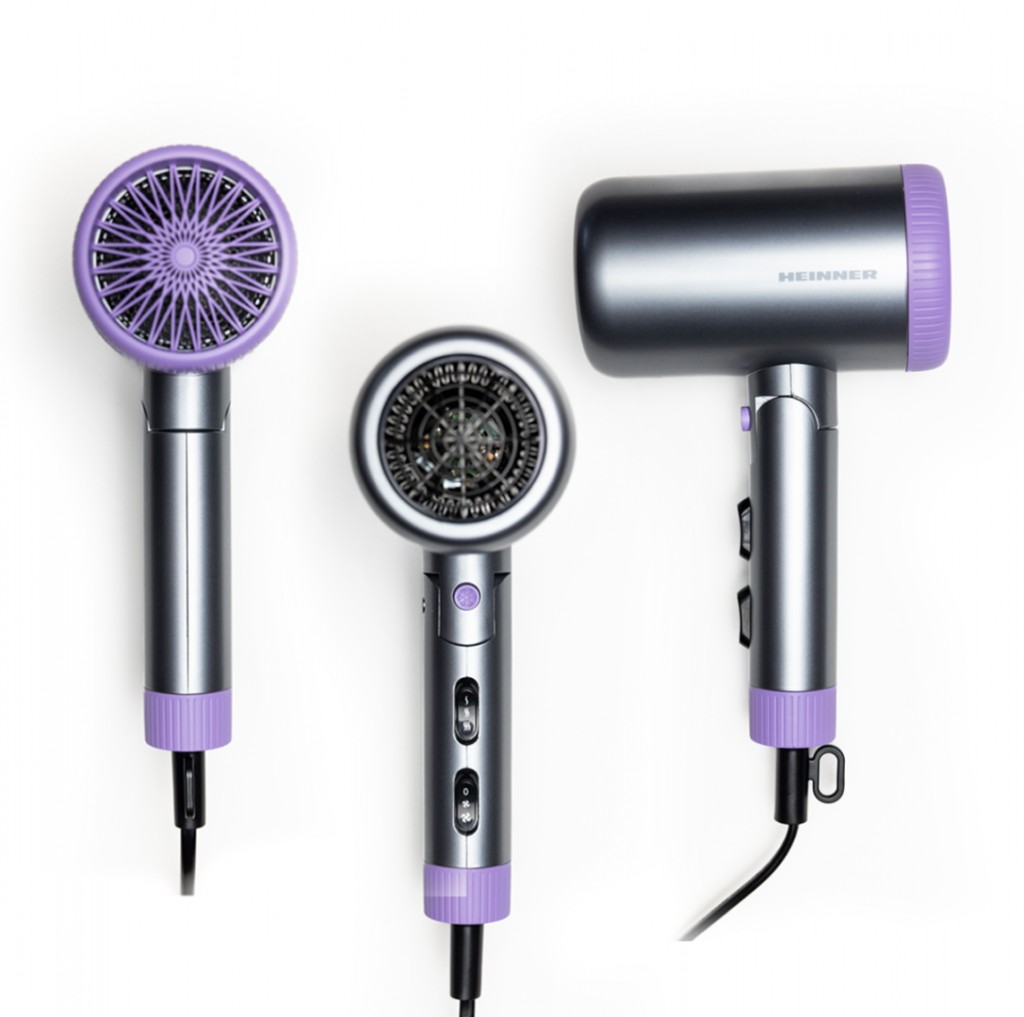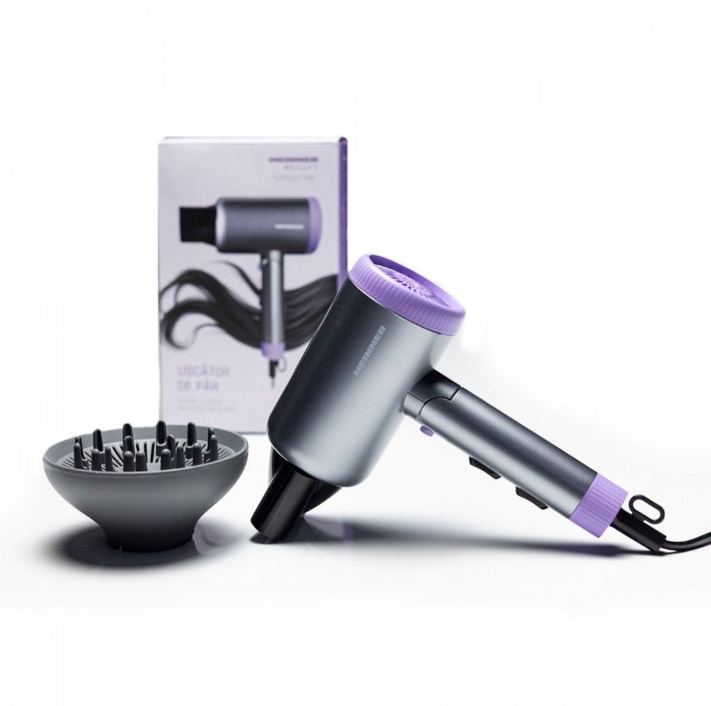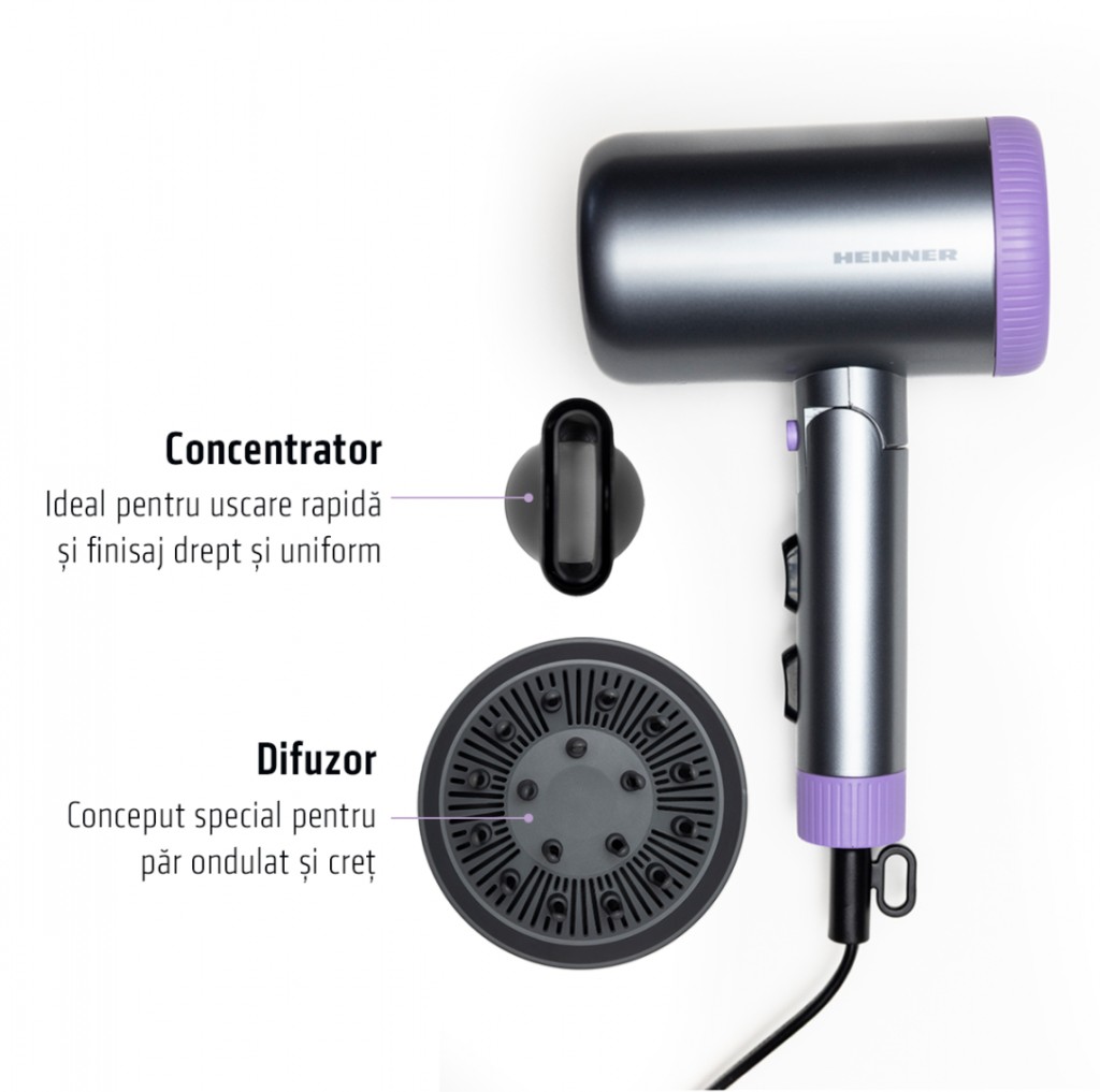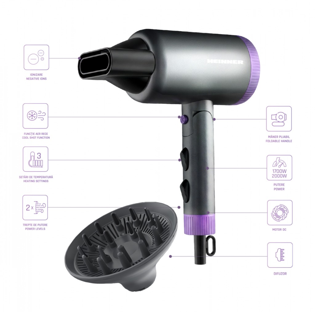 Uscator de par Heinner HHD-R20DC-GYV, ionizare, motor DC, putere: 1700-2000 W, 2 trepte de putere, 3 setari de temperatura, functie aer rece, maner pliabil, accesorii: concentrator si difuzor, culoare : gri si mov