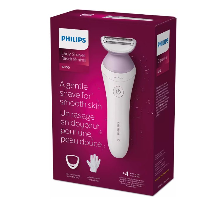 Wireless wet and dry shaver PHILIPS Lady Shaver Series 6000 BRL136/00, Wet&Dry, 40 min use, Exfoliating glove, White/Purple, L x W x H (mm) 60x120x185